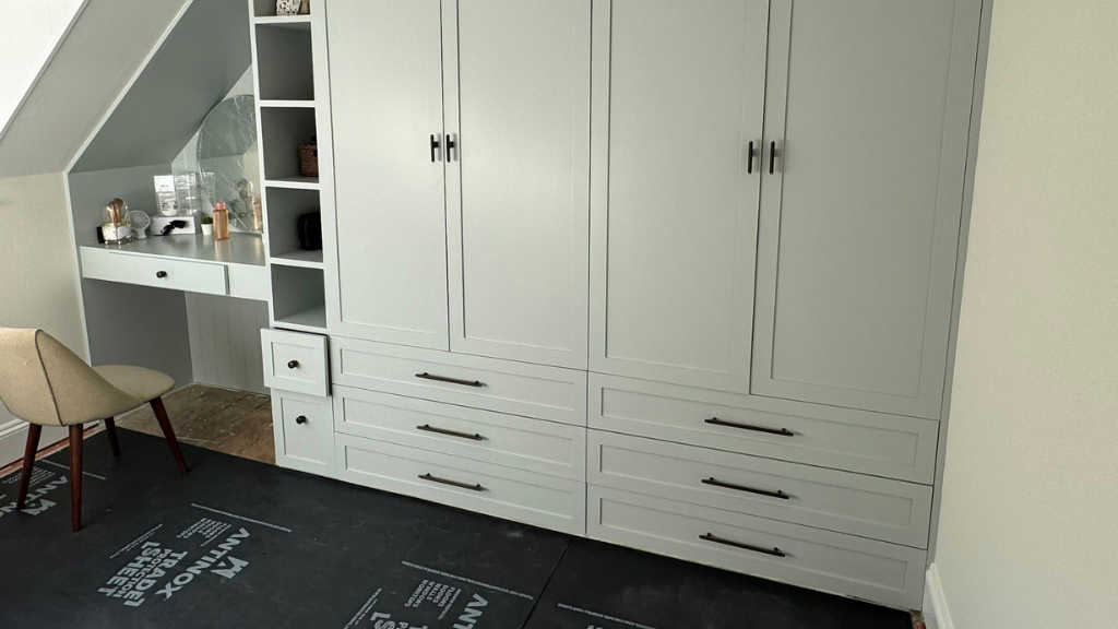 Built using MDF and hand painted in Farrow & Ball colours, designed to maximise storage and fit the room perfectly, including working around the sloped ceiling. Clean finish, solid build, and plenty of practical storage.